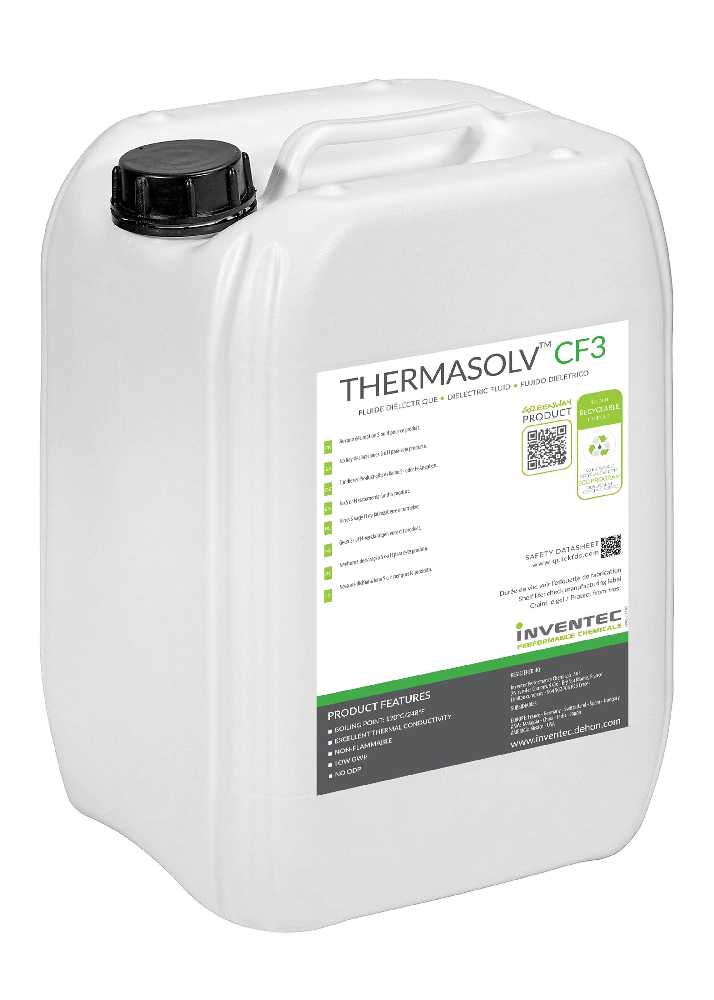 THERMASOLV CF2 is a dielectric heat transfer fluid, dedicated for 1-phase immersion or direct cooling systems. Its high electrical insulation properties allows to immerse electronics & electrical devices under power in the fluid. The favorable characteristics of the product’s viscosity, density and surface tension allows optimal surface contact, which contributes to a superior heat transfer performance.